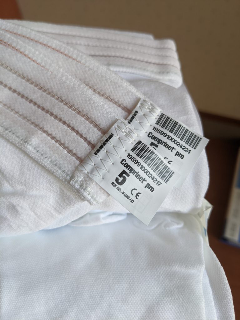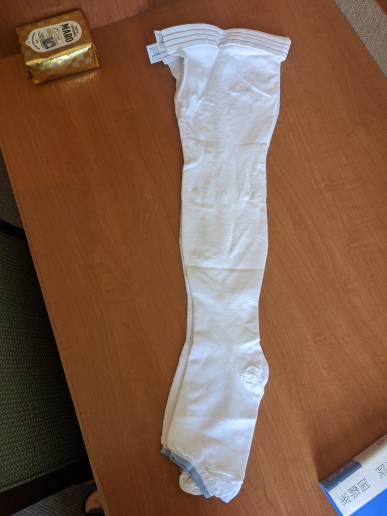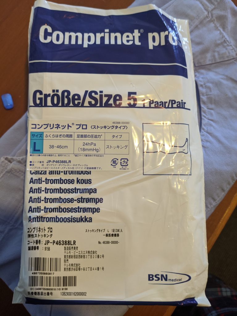 据《中国普通外科围手术期血栓预防与管理指南》统计,无预防的普外手术,引起深静脉血栓(DVT)并发症的几率最高可达40%,致死性肺栓塞几率最高为5%(年龄>40,有基础病)。而预防措施,除用药外,最主要的是机械方式,包括这双过膝弹力袜(以及下文将会提到的,也用到我身上的间歇充气加压泵)。