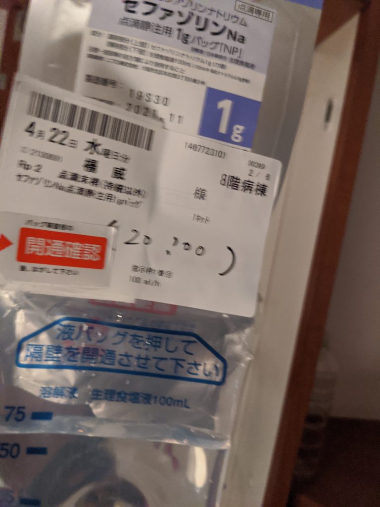 消炎用的是头孢唑林钠,营养液是ソルデム3A,葡萄糖加电解质,因为病情比预想严重,刀口较深,原定禁食2天改为4天,DAY7才能吃饭,期间全靠ソルデム3A挺着。